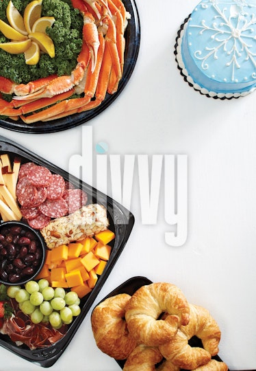 A meat and cheese tray, a croissant tray, a crab leg tray and a blue cake are served on a white surface.