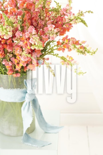 A frosted glass vase holds an arrangement of red, orange and pink snapdragons.