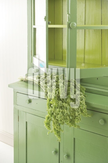 Angled shot of a green cupboard with a bouquet of green flowers lying on it.