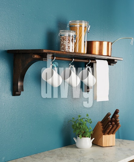 A kitchen workspace contains a shelf with mugs hanging from it, beans and pasta on top of it and knives and a potted herb on the counter top below.