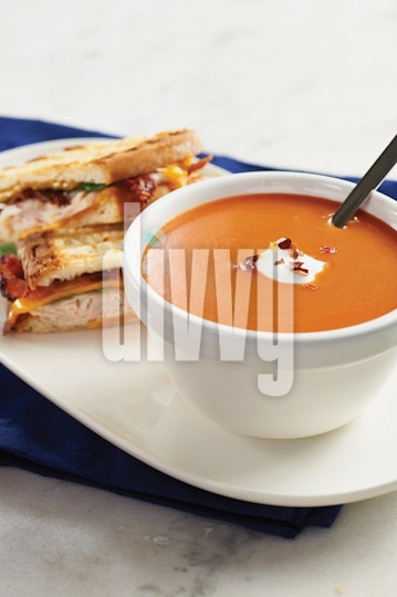 A bowl of tomato soup is garnished with sour cream and served with grilled panini filled with deli meat, melted cheese and bacon.
