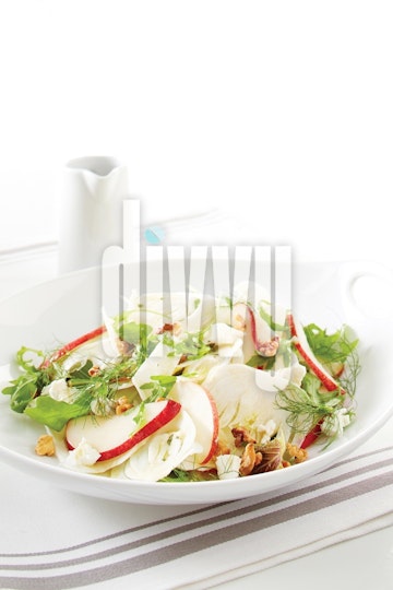 Sliced apples and crushed walnuts on a bed of lettuce in a white bowl sit on a white and brown striped napkin on a white table.