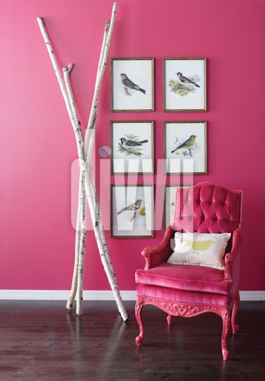 Vintage bird prints are hung on a hot pink wall above a pink velvet chair.