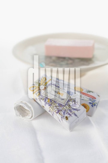 Two packages of lavender soap sit on a rolled linen towel next to an opened bar of soap in the background.