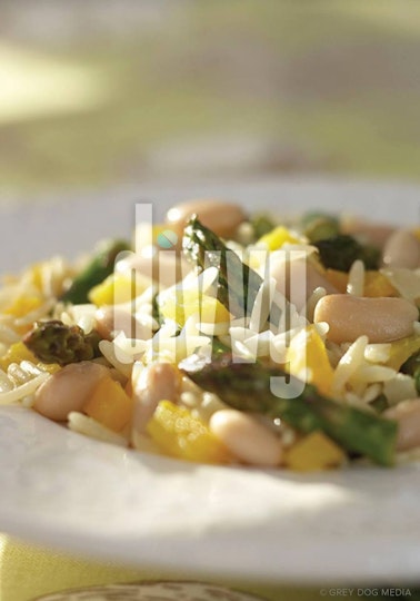Orzo pasta is topped with asparagus, peppers and white beans.