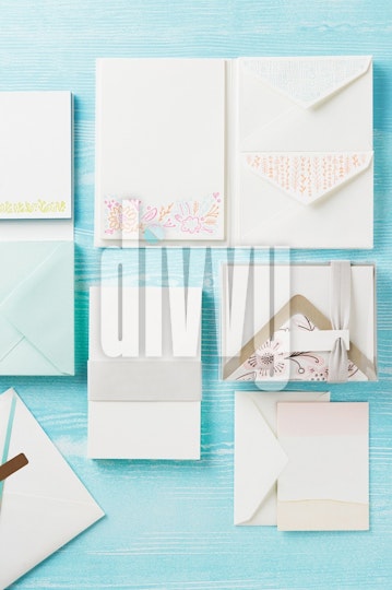 Printed greeting cards for any occasion are displayed on a blue wood background.