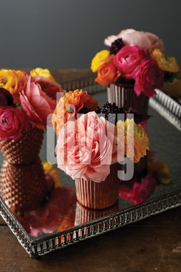 Small mismatched vases filled with flowers are displayed on a mercury glass tray.