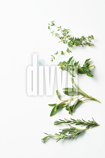 Sprigs of fresh thyme, mint, sage and rosemary are lined up on a white background.