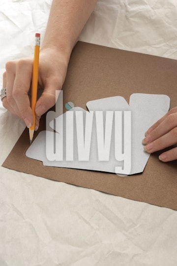 A woman's hand holds a pencil and traces a silver autumn cone template onto a brown piece of cardstock.