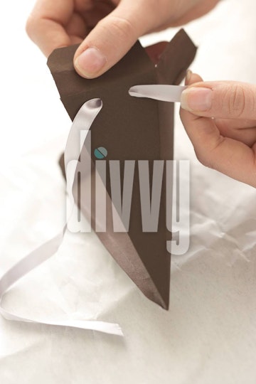 A woman strings a silver satin ribbon through holes in cardstock to construct a paper favor cone.