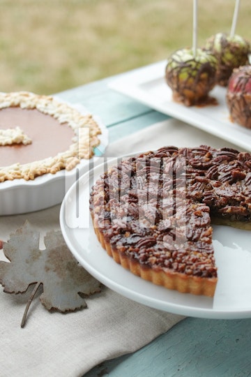 Pecan pie, pumpkin pie and caramel apples are displayed on serving trays on a dessert table at an outdoor fall party.