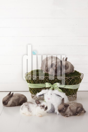 Five brown and white baby bunnies are gathered around a wire basket filled with moss tied with a ribbon next to a stuffed rabbit toy.