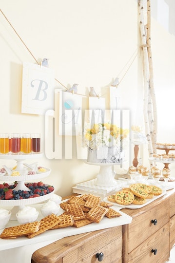 A spread of brunch foods—waffles, quiche tartlets, cake, muffins, fresh fruit and granola-yogurt parfaits—are arranged on a buffet with spring-theme decorations.