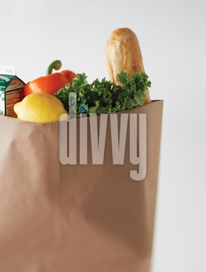 A paper grocery bag is filled with kale, peppers, lemons, a loaf of bread and dairy products.