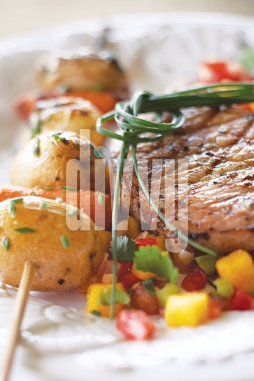 Grilled Pork Chop, Veggie Kabob and Mango Salsa