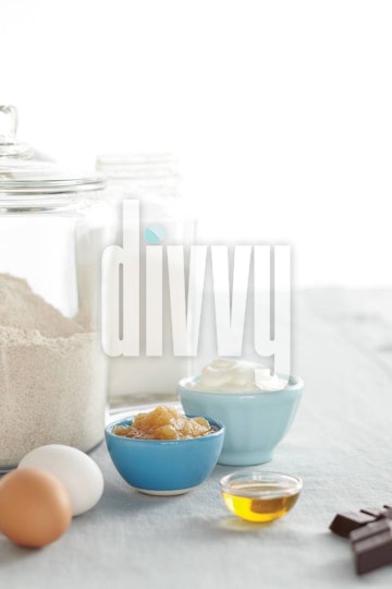 Healthier baking ingredients and substitutions—whole wheat flour, applesauce, yogurt, agave nectar—are arranged on a gray tablecloth.