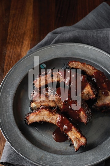 A thick drizzle of BBQ sauce covers smoked ribs served on a gray plate.