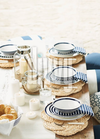 Floor pillows are set up around a table arranged for a beach picnic with rope placemats and a candles collected for a centerpiece.
