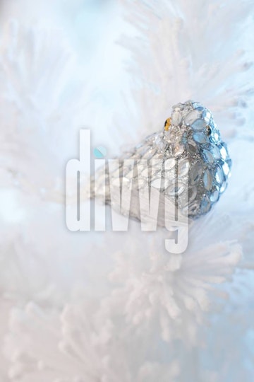 A silver beaded dove resting in a white flocked tree.