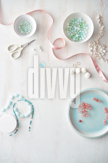 Blue, turquoise, pink, light pink, white, pearl, green and mint green beads arranged around ribbons, string and scissors on top of a painted wood surface.