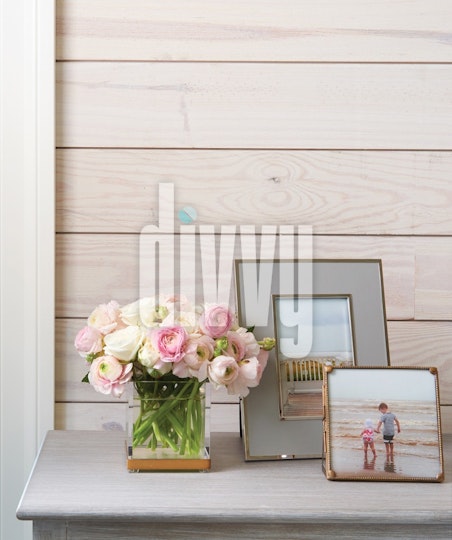Framed pictures are displayed with a vase of ranunculus flowers on a bedroom side table.