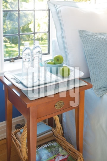 Bedside Table with Water Bottles and Green Apples