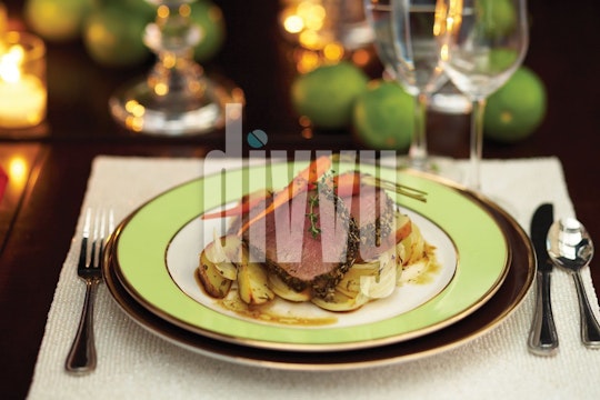 Slices of herbed beef tenderloin on top of garlic roasted potatoes and carrots are served at a formal green-and-gold place setting.