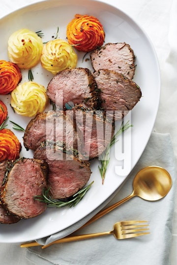 Herb-crusted beef tenderloin medallions are sided with piped mashed regular and sweet potato puffs and sprigs of fresh rosemary on a platter next to gold serving utensils.