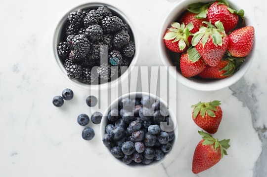 Three bowls filled with blackberries, strawberries and blueberries are arranged on a marble countertop with loose berries scattered on the surface.