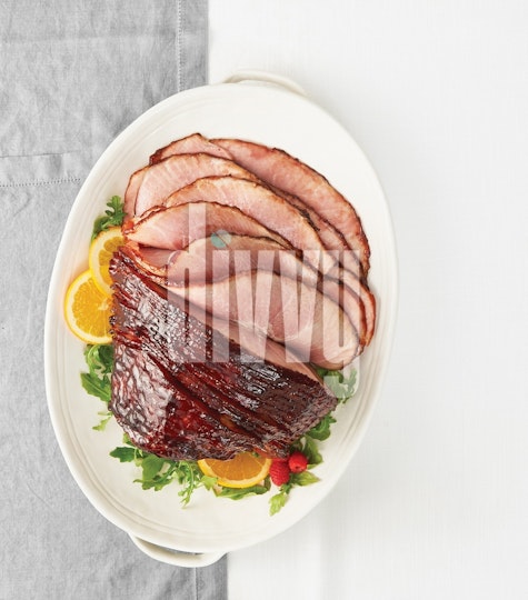A spiral-sliced ham is served on a white platter garnished with arugula, orange slices and raspberries on a white table with a gray tablecloth.
