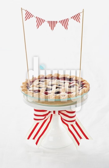 A mixed berry pie with a lattice top is served on a white cake stand decorated with a red and white ribbon and bunting in front of a white background.