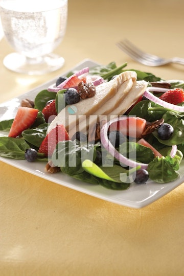 Thin slices of chicken top a spinach and berry salad with rings of red onions and pecans.