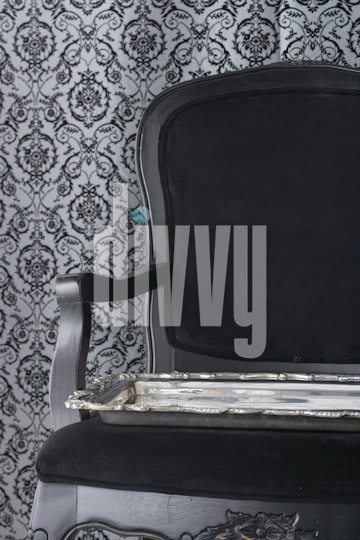 A silver serving platter rests on black velvet chair in front of a black damask wall.