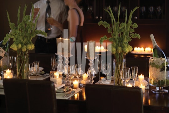 A man and woman in fancy dress hold wine glasses behind a formal table set with candles, flowers and wine glasses.