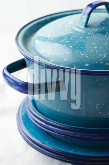 A speckle blue enamelware camping cooking pot rests on a stack of enamelware plates.