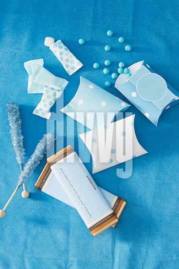 Sea salt candy bars with light blue wrappers, blue rock candy on a stick and candy in blue and white polka dot packages rest on a turquoise tablecloth.
