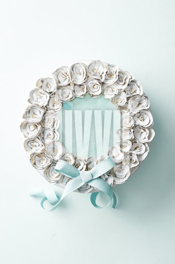 A light blue circle gift box is embellished with paper flowers and a blue ribbon bow.