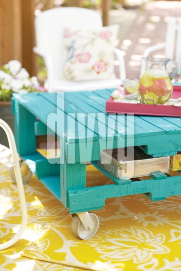 A DIY blue outdoor coffee table is topped with pink serving tray with lemonade on a patio.