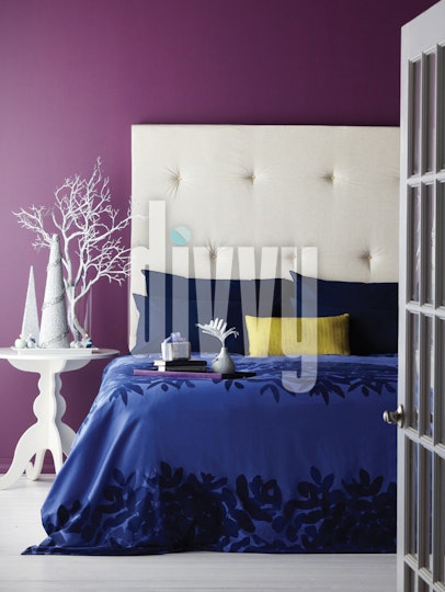 Winter-white decorations update a side table in a saturated purple and blue bedroom.