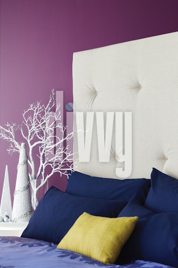 A tufted white headboard rises high above deep blue bedding in a purple bedroom.