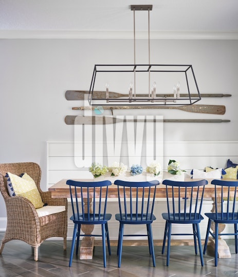 Four blue chairs and one wicker chair sit in front of a large wood table with hydrangea centerpieces near bench with oars displayed on wall.