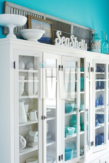 Various dishes are arranged by color in a white china cabinet in a beachy dining room.