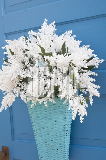A teal blue basket filled with white astilbe bridal veil flowers hangs on a blue door.