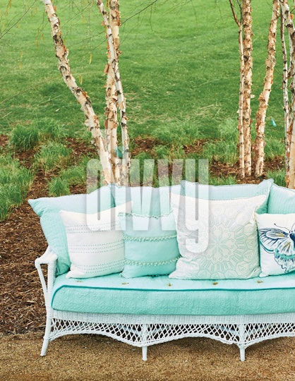 A wicker bench sofa with teal cushions is placed in front of a grassy park and trees.