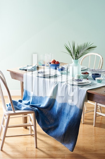 Four white and blue place setting sit on a dip-dyed blue tablecloth with a centerpiece of green leaves.
