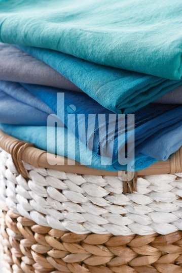 Hand-dyed blue and green fabrics are folded on a wicker laundry basket.