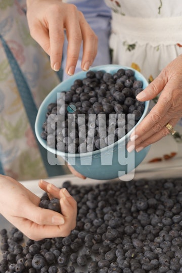 Hands hold a bowl of blueberries over a large tray of blueberries.