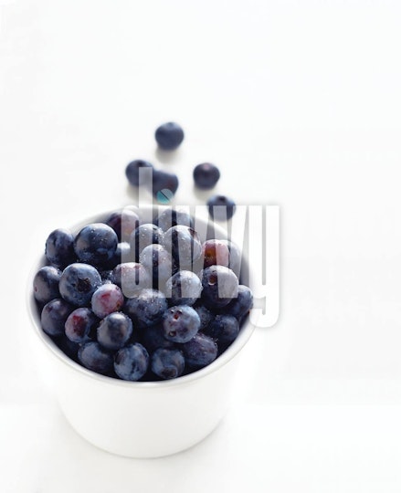 Rinsed fresh blueberries are piled in a white bowl with more berries scattered next to it on a white surface.