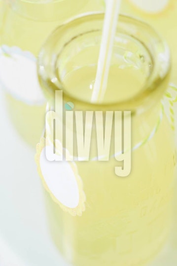 Homemade lemonade is served in a glass bottle decorated with a label around the neck.