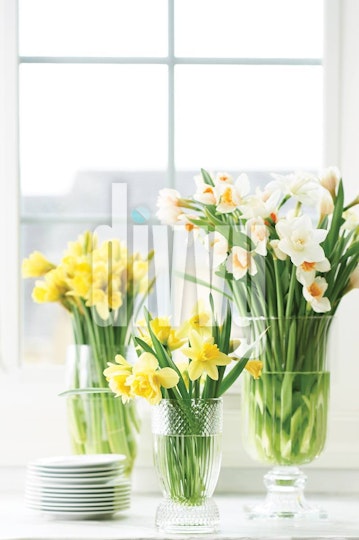 Three vases bouquets of daffodils are displayed on a table in front of a window.